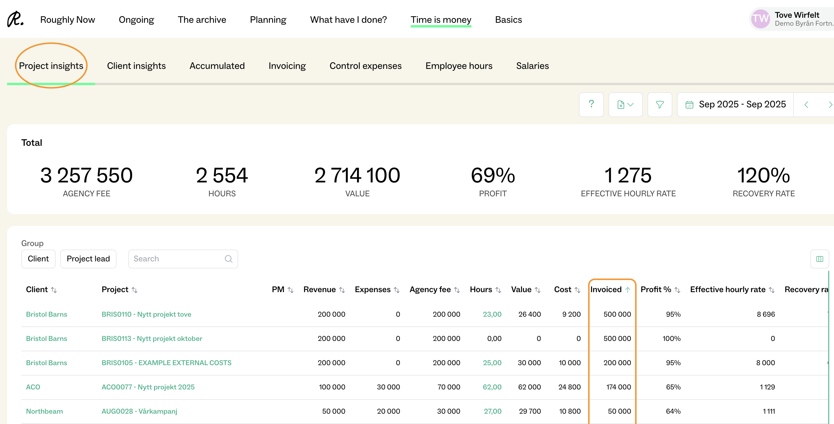 NOTE: You have to choose the specific month which you want to close in the time interval, and you should be in the tab Project Insights and NOT Invoicing!