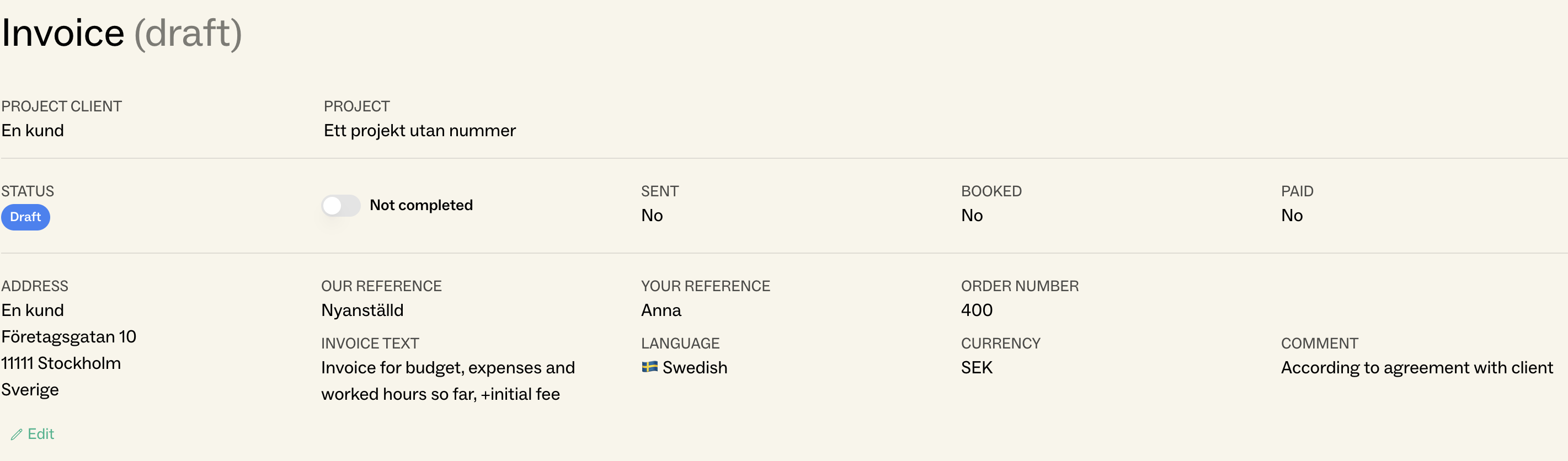 In the next section, you can adjust information populated from the customer’s details, such as address, invoice language, and currency. Click Edit to make changes, or click directly on the field you want to adjust.