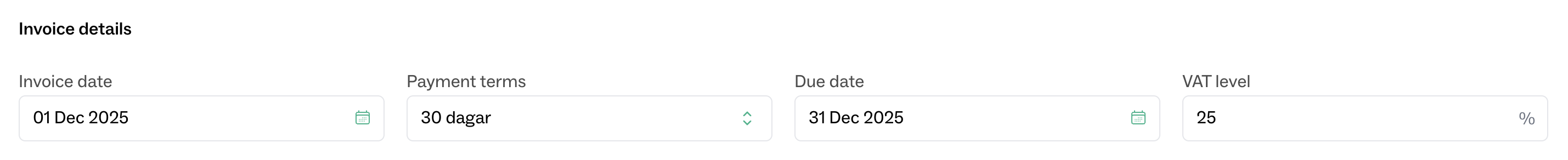 Here you specify invoice date, payment terms, and VAT rate. Payment terms and VAT rate are pre-filled from the customer if defined there. Changes on the invoice do not affect the default customer settings for future invoices.