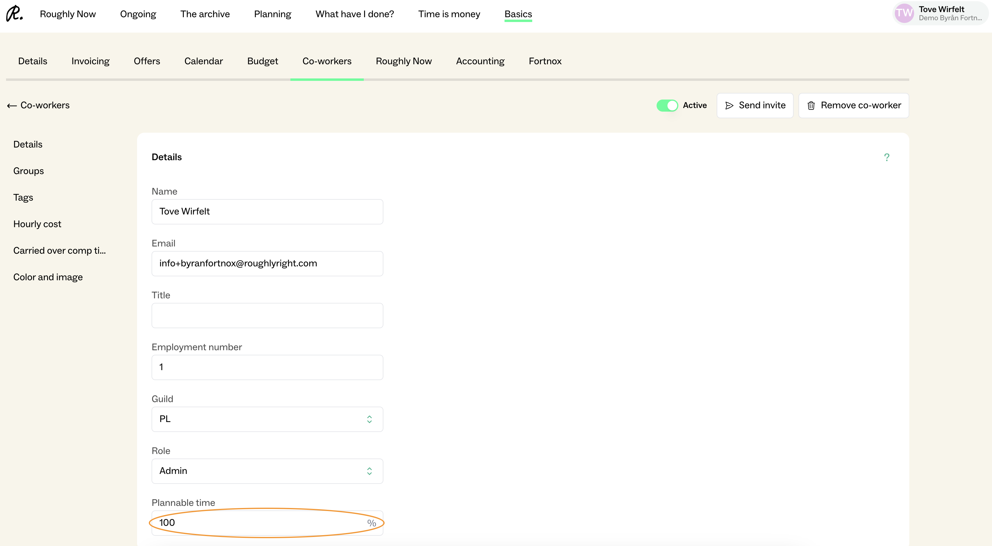 Scrolla ner till "Planerbar Tid" och ändra till den % som medarbetaren kan planeras