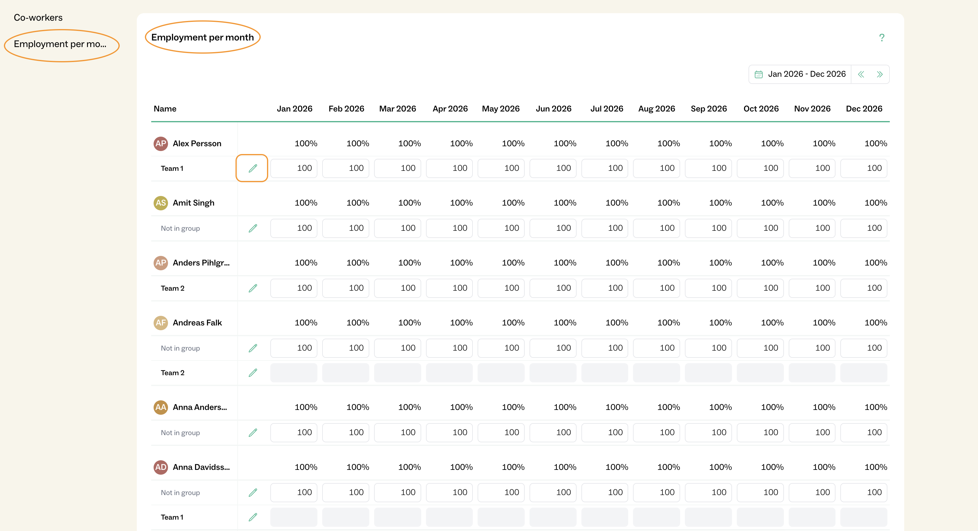 Ändra % för hur mycket personen ska arbeta (om man vill ändra alla månader för kommande året så kan man klicka på pennan)