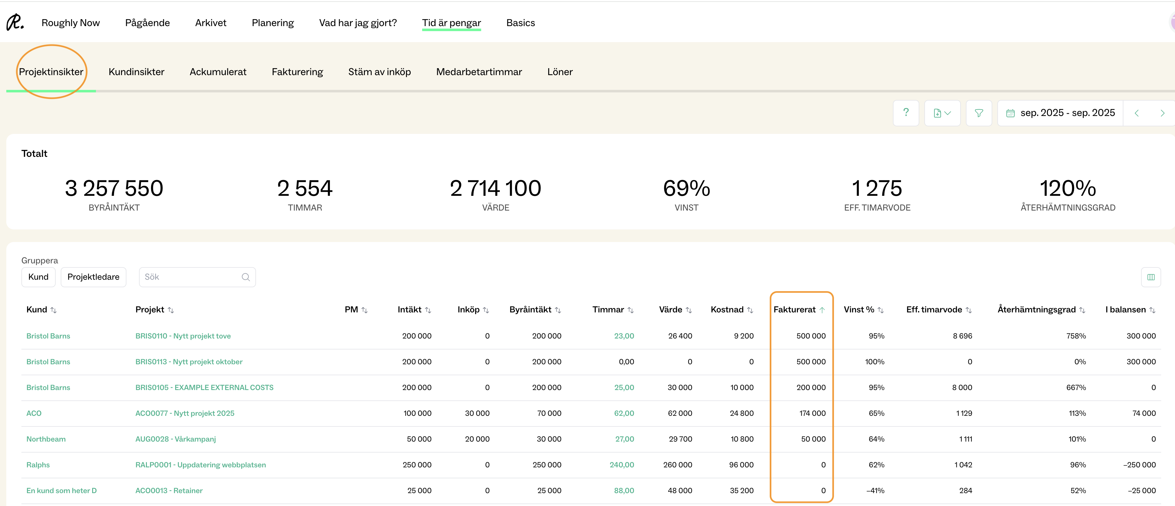 Gå till Tid är pengar > Projektinsikter > Fakturering (notera att du ska vara på fliken Projektinsikter och ej Fakturering) och jämför mot Fortnox