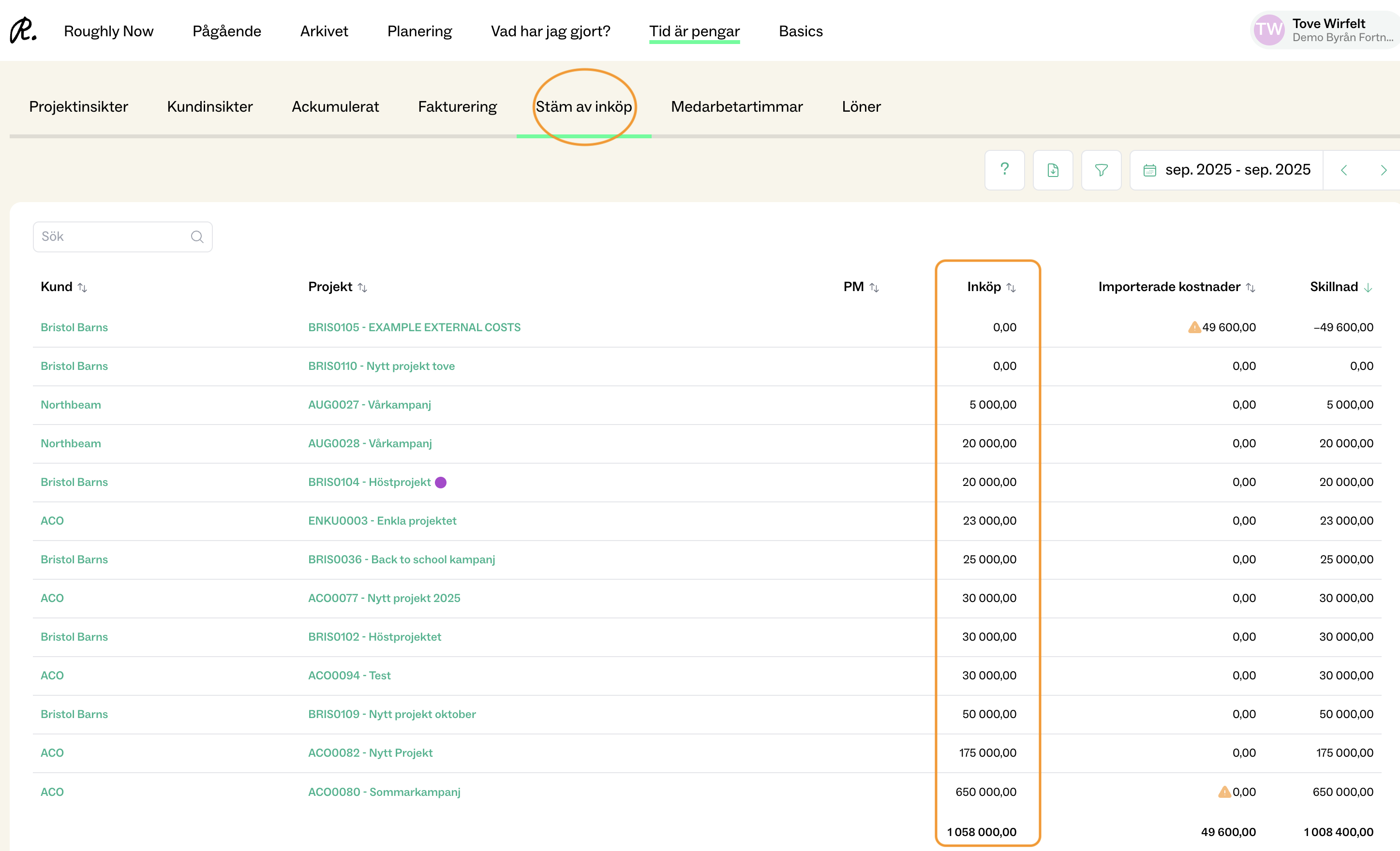 Varför: För att se att kostnaderna är de samma i Roughly Right och Forntox. Om kostnaden inte är den samma så kommer inte byråintäkten / bruttovinsten bli den samma efter att vi har periodiserat intäkten. Hur: Gå till Projektinsikter > Stäm av Inköp. Se till att skillnaden mellan kolumnerna är 0.