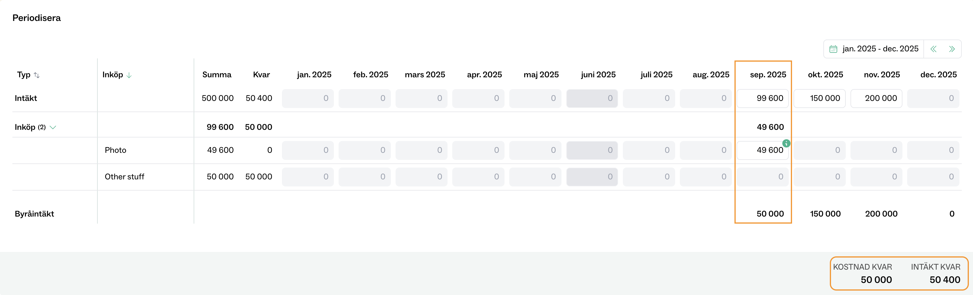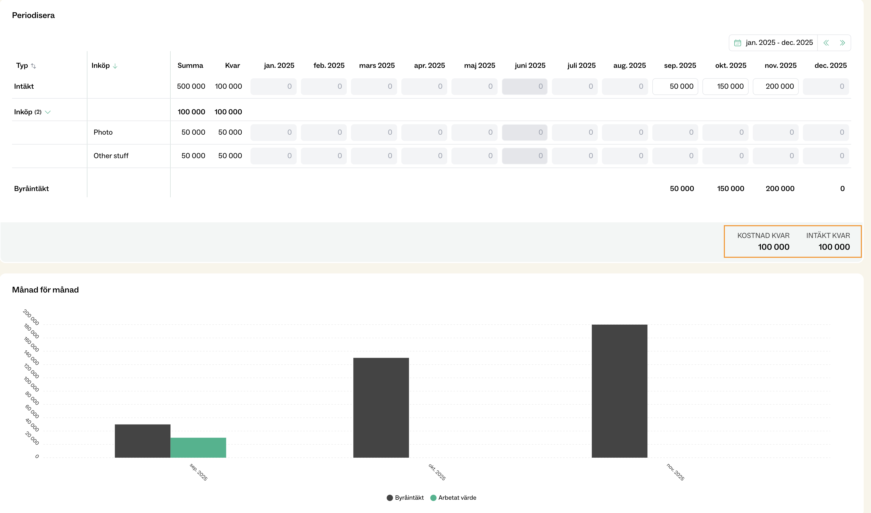 I denna vy ser jag att jag har två budgetposter som inte ännu är inkomna och avräknade mot budgeten. Totalt är det 100 000 kvar i kommande kostnader och 150 000 i intäkt som jag har kvar att periodisera.