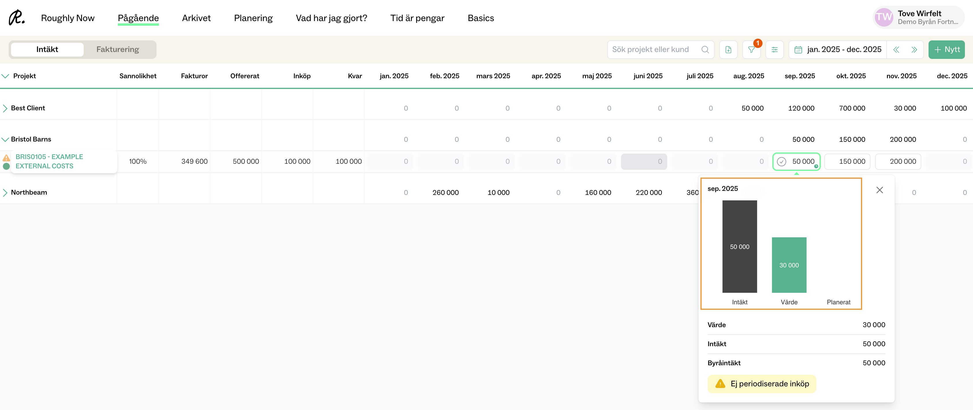 Intäkten avräknas i “Pågående” listan eller inne i projektet i rutan som kallas “Periodisera”. I exemplet nedan är det avräknat en intäkt på 50 000 som kan jämföras med ett arbetat värde på 30 000. Här får jag alltså först ta ställning till ifall det är rimligt, eller om jag vill sänka min intäkt till 30 000. Hittills har jag inte tagit in några inköp.