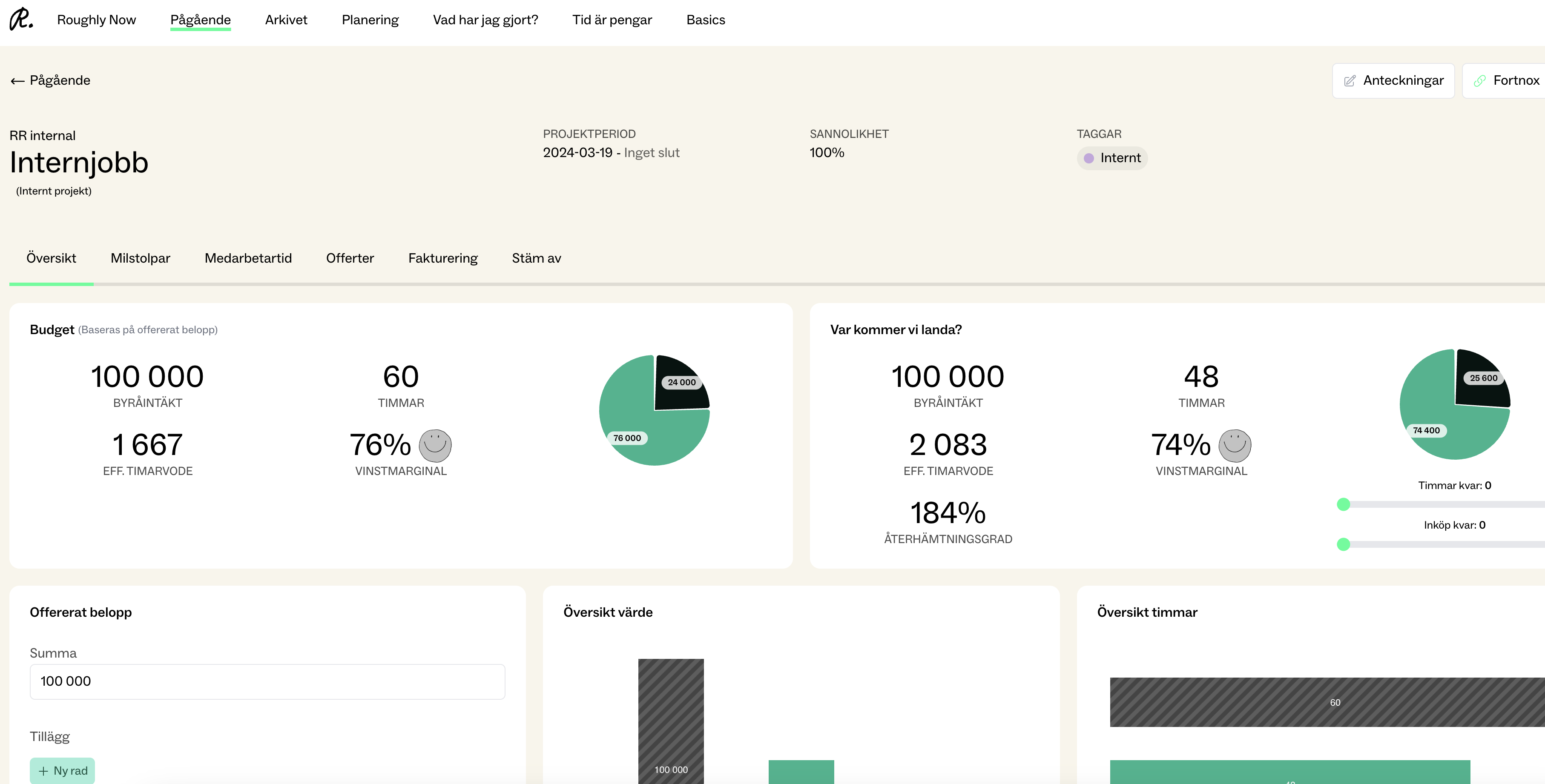 Vad: Projekt Detaljsidan är det enklaste sättet att få en överblick över ditt projekt. Här kan du skapa budgetar och offerter, lägga till milstolpar, se tidrapporter, granska kostnader och fördela resurser. Fliken Översikt förklaras närmare nedan. För att komma till Projekt Detaljsidan, gå till Pågående och klicka på det specifika projektet.