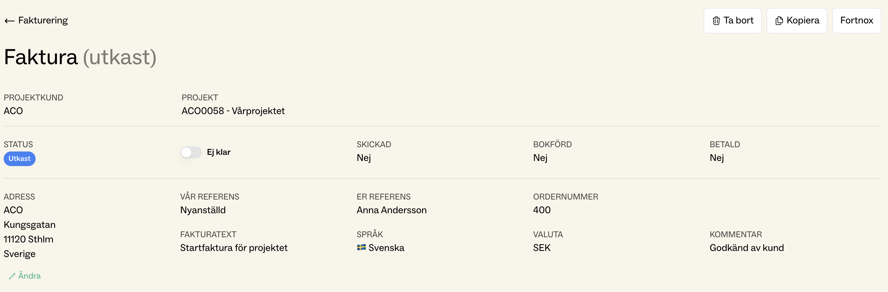 I nästa sektion justeras sånt som fyllts i på fakturan utifrån kundens uppgifter, exempelvis adress, fakturaspråk och valuta. Klicka på "Ändra" för att göra ändringar, eller direkt på det fält du vill justera.