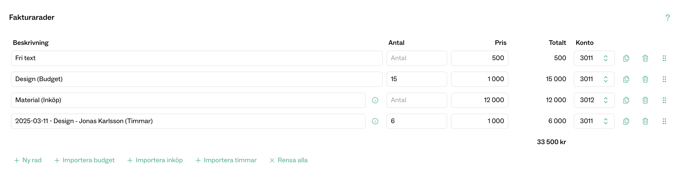 När raderna importerats kan pris och antal per rad justeras fritt. Ändringar påverkar dock inte den underliggande tidrapporteringen.