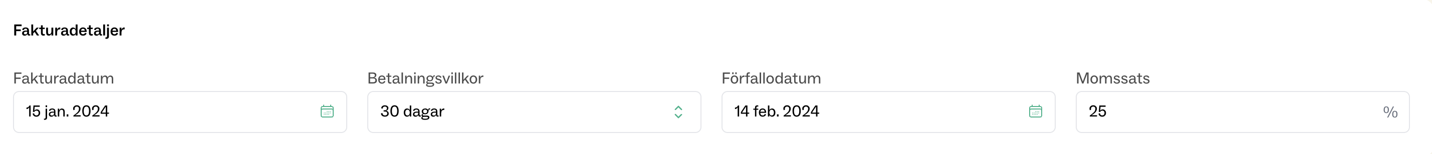 Här anges fakturadatum, betalningsvillkor och momssats. Betalningsvillkor och momssats är ifyllt från kunden om det angetts där. Ändringar på fakturan påverkar inte vad som är förvald på kunden vid nästa fakturatillfälle.