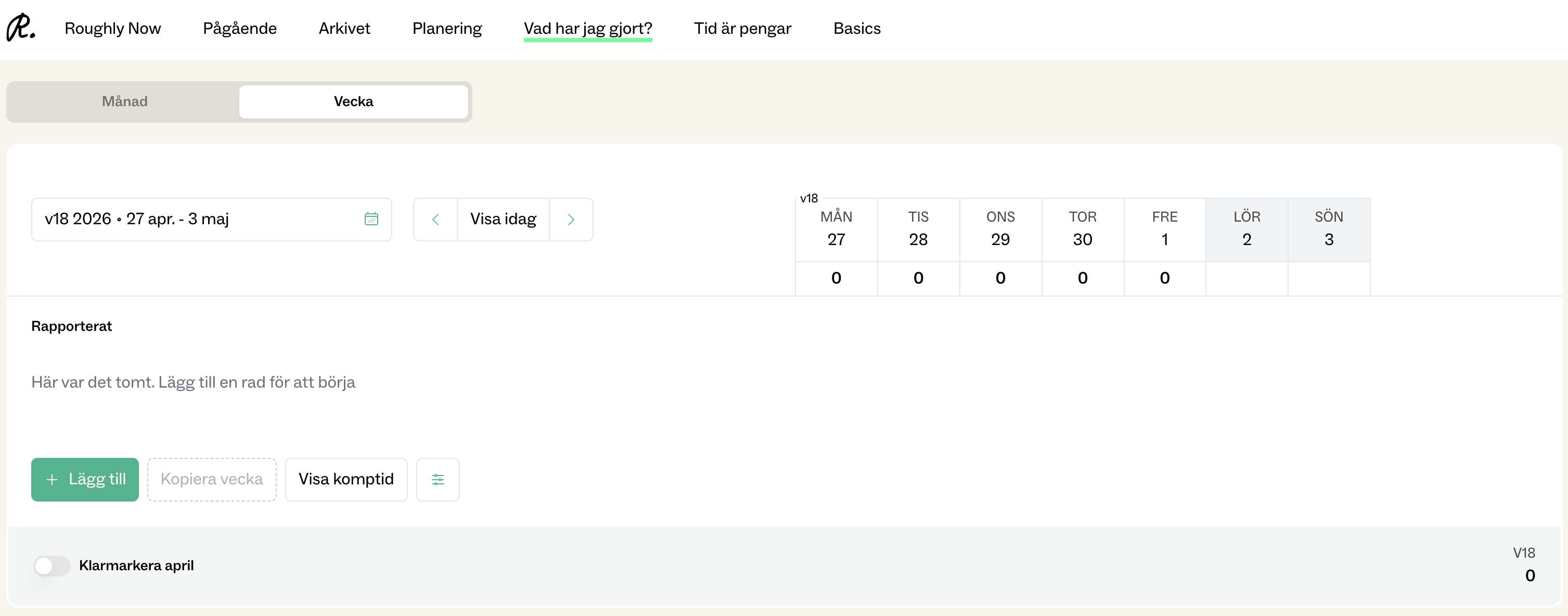 Veckoplanering – Om du väljer den här vyn kan du enkelt lägga till tid för en aktivitet för hela veckan på en gång (till skillnad från månadsvisningen där du måste lägga till en ny rad för varje enskild dag).